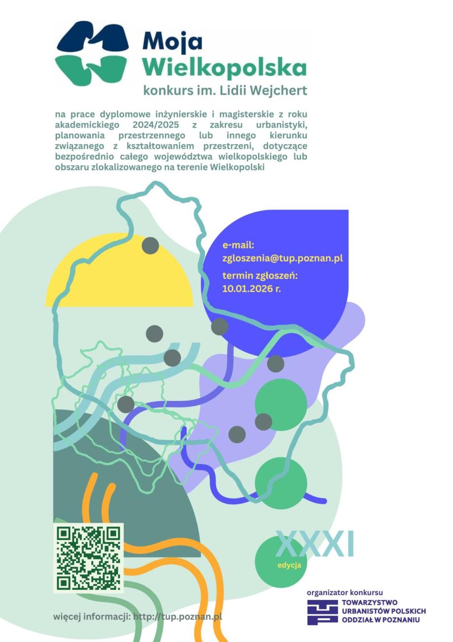 Towarzystwo Urbanistów Polskich Oddział w Poznaniu ma przyjemność poinformować o rozpoczęciu naboru prac dyplomowych do XXXI edycji konkursu „Moja Wielkopolska” im. Lidii Wejchert.